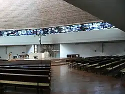 Durch die schlichte Ausstattung kommen die künstlerisch gearbeiteten Kirchenfenster, gestaltet von Diether F. Domes aus dem Jahr 1985 besonders zur Geltung.[2] Die Kirche wurde nach den damals neuen Richtlinien des Zweiten Vatikanischen Konzils ausgerichtet. Eine seitliche schräge Anreihung der Kirchenbänke macht es den Gottesdienstteilnehmern möglich, sich nahe um den Altar zu versammeln. Auffällig ist der Tabernakel von Wendelin Matt (Trossingen) aus dem Jahr 1984, der der Form der Bundeslade nachempfunden ist.[2]