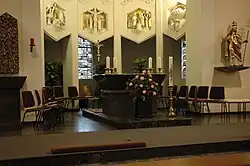 Nach den Vorgaben des Zweiten Vatikanischen Konzils wurde in den 1960er Jahren ein massiver Altar aus Aachener Blaustein durch den Bildhauer Sepp Hürten gefertigt. Die Apsis wurde neu gestaltet und ist nun mit weißen Blattornamenten versehen. Im Scheitel der Apsiskrone befindet sich eine Taube als Symbol des Heiligen Geistes. Die geöffnete Apsiswand wird durch vier Pfeiler getragen, zwischen ihnen sind fünf goldene Reliefs mit unterschiedlichen Themen angebracht: vier Opferszenen des Alten Testaments (Abel, Noah, Abraham und Melchisedech) und in der Mitte ein Relief mit dem Kreuzesopfer Jesu Christi.[2] Die Säulenabschlüsse zeigen die Evangelistenikonografien.
