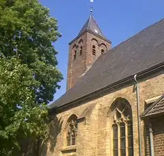 Die ehemals dem hl. Lambertus geweihte Kirche wurde erstmals 1298 urkundlich erwähnt. Die dreischiffige Pseudobasilika von drei Jochen entstand in mehreren Bauabschnitten. Der Chor mit 3/8-Schluss ist einjochig. In die Kirche wurden Kreuzrippengewölbe eingezogen. Die Untergeschosse des vorgesetzten dreigeschossigen Westturms aus Tuffstein stammen vom 12. Jahrhundert. Die Aufstockung aus Backstein ist spätgotisch. An der Westseite des Turmes wurde 1857 eine Verstärkung in Backstein angefügt. Der Sturz des Portals im nördlichen Seitenschiff ist mit 1514 bezeichnet.[1]