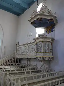 Die Kanzel, die auf einer Statue des Mose ruht, stammt aus dem Jahre 1634 und ist ein Werk des Münstermann-Schülers Onno Dircksen. Die sichtbaren Seiten des Kanzelkorbes zeigen die Evangelisten Matthäus, Markus, Lukas und Johannes.[2] Die heutige weiße Fassung entspricht dem Zustand des 19. Jahrhunderts.