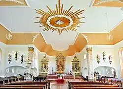 Im Inneren der Kirche befinden sich spätbarocke Altäre und eine ebenfalls spätbarocke Kanzel der Werkstatt Guldner oder des Bildhauers Graner. Von dem Bildhauer Graner stammen möglicherweise auch die spätbarocken Figuren auf den Altären. Von den Architekten Ludwig Becker und Anton Falkowski (Mainz) stammt der 12 m × 9 m große Stuck-Strahlenkranz mit Engelsköpfchen und vollplastischer Heilig-Geist-Taube in der Deckenkonstruktion der Vierung, der in den Jahren 1928–29 angefertigt wurde. Das barockisierende Orgel-Prospekt wurde 1987 von der Firma Mrziglod (Tholey) angefertigt. Weitere Ausstattungsgegenstände sind die Kirchenbänke von 1764 bis 1766 und der spätbarocke Relief-Kreuzweg[6].