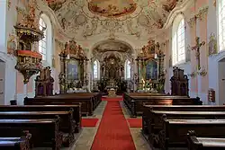 Die historische Ausgestaltung der Kirche mit Stuckaturen sowie Altären, Kanzel, Chorgestühl und Kirchenbänken in den Formen des Rokoko ist vollständig erhalten. Am Korb der Rokokokanzel aus dem Jahr 1766 befinden sich Gemälde der Kardinaltugenden, auf dem Schalldeckel geschnitzte Putten als Personifikationen der vier Erdteile. Die prächtig ausgestattete Decke mit Medaillons, vergoldeten Rocaillen, Puttenfiguren und einem zentralen Deckengemälde mit dem Martyrium des Hl. Dionysus stammt aus der zweiten Hälfte des 18. Jahrhunderts. Der um 1765 angebrachte Stuck wird Andreas Henkel zugeschrieben. Die Fresken hat 1766 Johann Baptist Enderle gestaltet, ferner die Altarretabel. Das Altarretabel des Hochaltars stellt Dionysius von Paris, den Patron der Kirche, in der Glorie dar. Alle Altarbilder werden von in Gold und Silber gefassten Heiligenfiguren flankiert.