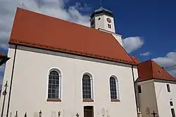 Die 1626 gebaute Saalkirche besteht aus einem Langhaus, einem eingezogenen Chor mit Fünfachtelschluss im Osten, einem Chorflankenturm auf quadratischem Grundriss, der im Kern auf einen Chorturm aus dem 14. Jahrhundert zurückgeht, an der Nordwand und der Sakristei an der Südwand des Chors. Der Chorflankenturm wurde 1682 nach einem Plan von Jakob Engel mit einem achteckigen Geschoss aufgestockt, das die Turmuhr und den Glockenstuhl beherbergt, und mit einer Zwiebelhaube bedeckt. Der Chor ist halbrund geschlossen und wird von zwei zierlichen Oratorien flankiert.