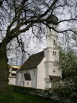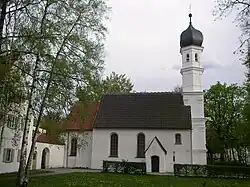 1709 erfolgte der Anbau einer Sakristei in barockem Stil. Der Turmhaus wurde erhöht und mit einem Zwiebelturm versehen. Zudem wurden die gotischen Fenster teilweise zugemauert und durch neue rundbogige Fenster ersetzt. Ein flaches Tonnengewölbe wurde im Langhaus eingezogen. Die Stuckarbeiten daran sind in Grün und Rot ausgeführt und stammen von Francesco Marazzi, der auch in Irsee, Andechs und Weißenau wirkte. Der zweisäumige barocke Altar trägt einen braun marmorierten Holzaufbau mit vergoldetem Akanthus- und Palmettendekor.[5] Das Altarblatt gilt seit den 1920er-Jahren als verschollen. Im Laiengestühl aus Eichenholz wiederholt sich in den Schnitzereien das Akanthusmuster. Szenen aus dem Leben des Heiligen Dominikus schmücken die Brüstung der hölzernen Westempore.