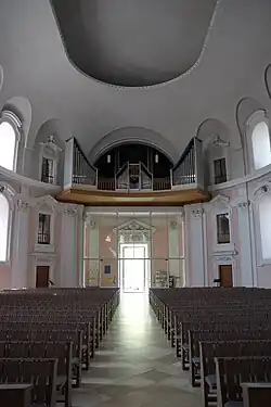 Die heutige Hauptorgel wurde 1963 nach Plänen von Prof. Friedrich Högner von der Orgelbaufirma Rieger errichtet. Bei einem späteren Umbau wurde die Disposition verändert.[7] Das Instrument hat 43 Register auf drei Manualwerken und Pedal.[8]