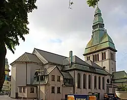 Die Hauptansicht der weiß verputzten Kirche ist die sehr repräsentativ und monumental gestaltete Turmfassade. Der durch breite Lisenen dreigeteilte westwerkartige Turm öffnet im Erdgeschoss mit zwei Doppelpfeilerstellungen, die jeweils von einem Pfeiler flankiert werden, zur offenen Vorhalle mit Balkon. Das mittlere der drei Portale wurde mit Glassteinen modern vermauert. Die Pfeiler, das Balkongebälk und die Brüstung sind jugendstilartig mit Kannelurenmanschetten, Blattkapitellen, Klötzchenfriesen, Kassettierungen und Blüten verziert. Niedrige Skulpturen der Evangelistensymbole ruhen auf Balustradensockeln über der Pfeilerposition. Hochovale Fenster mit anliegender Verdachung sorgen für die Belichtung der Orgelempore. Das Turmgeschoss darüber ist blockartig und ist durch Lisenen wenig gegliedert: Eine breitere, hochrechteckige Mittelfläche mit Turmuhr ist von zwei schmäleren hochrechteckigen Flächen mit Engelreliefs umgeben. Die darüber positionierten Schallöffnungen sind durch hochrechteckige Lisenen-Fries-Rahmen außen in zwei bzw. innen in drei Bahnen geteilt.