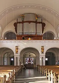 Das Instrument besitzt 53 Register, verteilt auf drei Manuale sowie Pedal. Die drei Manuale weisen eine dynamische Abstufung auf: forte, mezzo forte, piano. Gleichzeitig sind die Manuale auch von der Charakteristik her unterschiedlich: Hauptwerk (Prinzipalchor vom 16′ bis zur Mixtur); 1. Schwellwerk (Flötenchor vom 16' bis zum Cornett); 2. Schwellwerk: (Streicherchor vom 16′ bis zur Harmonia aetheria)[7].