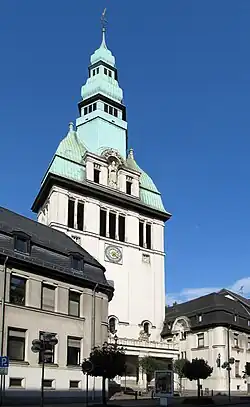Das Turmdach nimmt die Dreiteilung des Unterbaues auf. In der Mittelachse birgt eine Figurennische in Form eines Palladio-Motivs die Statue des heiligen Eligius in bischöflichen Gewändern, Mitra und Krummstab. Geschweifte Seitendächer leiten zum oktogonalen Mittelhelm über, welcher in einer aufwändigen Laternenkonstruktion mit Glockendach endet.[4]