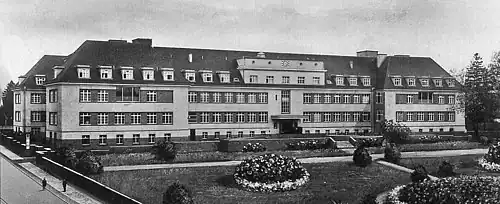 Das Gebäude entstand als eine zweistöckige Dreiflügelanlage mit leicht nach außen strebenden, wiederum dreiflüglich konzipierten Seitenflügeln. Der mit Münchner Rauputz belegte Ziegelbau enthält Spannbetondecken. Klinkerflächen fassen die Fenster zu Gruppen zusammen. Der Mitteltrakt trägt ein fünfachsiges Dachhaus mit Uhr, und die zahlreichen Dachgauben belegen einen kompletten Ausbau des Dachgeschosses. Das Haus war mit allen technischen Errungenschaften der damaligen Zeit ausgestattet.