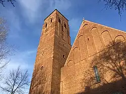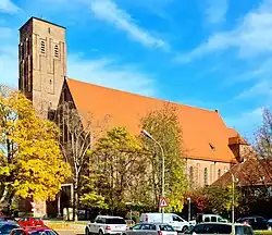 Die nach Osten ausgerichtete Kirche ist ein traditioneller unverputzter Blankziegelbau. Durch die abweichende Farbgebung der Ziegel wegen der unterschiedlichen Brenndauer des Materials konnte eine farblich abwechslungsreiche Struktur des Sichtmauerwerks geschaffen werden. Der kompakte Baukörper erstreckt sich auf einer Länge von 70 Metern und gliedert sich in ein Kirchenschiff mit 30 Metern Höhe und einem etwas niedrigeren, eingezogenen Chor.