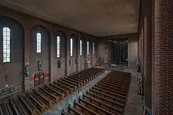 Der saalartige, monumentale Innenraum wird oben durch eine Sichtbetondecke abgeschlossen. Die Wände sind wie im Außenbereich in Blankziegeltechnik ausgeführt, durch das Rundbogenmotiv strukturiert und gliedern das zehnachsige Kirchenschiff und den dreiachsigen Chor. Die beiden Treppentürme am Übergang vom Kirchenschiff zum Chor öffnen sich oratorienartig zum Kirchenraum hin. Die mit künstlerisch gestaltetem Buntglas ausgestatteten Fenster an der Westfassade wurden von der Glas- und Textilkünstlerin Hilda Sandtner geschaffen.[1]