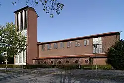 Das Gebäude wurde von 1956 bis 1957 nach Plänen von Otto Weicken, Unna, errichtet und 1958 konsekriert. Der rote Klinkerbau ist durch Lochfenster gegliedert und mit flach geneigten Dächern gedeckt. In der Mitte der Giebelseite ist eine zurückgesetzte weiße Fläche mit einer Fensterrosette sichtbar, davor sind vertikale Stützen frei aufgestellt.