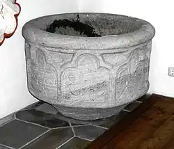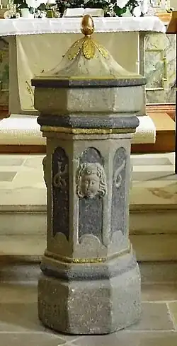 - Unter der Kanzel ist ein gotischer Taufstein (um 1400) in Form einer großen Sandstein-Schale gelagert. Sie besitzt einen umlaufenden Maßwerkfries und Lilien in den Feldern.[17] In Gebrauch ist ein achteckiger Taufstein, eine Steinsäule mit leicht nach außen geweiteten Wasserbecken, bezeichnet mit der Jahreszahl 1699 und geschmückt mit reliefartigen Engelsköpfen. Er steht in der Mitte vor dem Chor. Der Kronleuchter darüber stammt von 1883.[18]