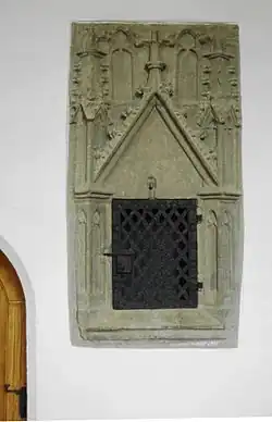 - An der Chornordwand hat sich eine Sakramentsnische aus dem frühen 15. Jahrhundert erhalten, die von einem geschmiedeten Rautengitter verschlossen ist, einen spitzen Dreiecksgiebel mit Kreuzblume und Fialen aufweist.[16]
