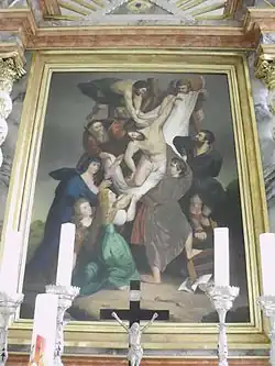 - Der Altar mit seitlicher Akanthusdekoration ist eine barocke Schreinerarbeit aus Ellingen von 1707.[14] Das gerahmte Altarbild von 1840 zwischen den beiden marmorierten glatten und den beiden gewundenen Säulen mit Blattranken zeigt die Kreuzabnahme Jesu durch fünf Männer und drei Frauen, eine Kopie der „Kreuzabnahme“ von Peter Paul Rubens, ausgeführt von Amalie von Peter aus Weißenburg.[15] Im Aufzug ist in einem Dreieck, von dem 17 Strahlen ausgehen, das Auge Gottes dargestellt.