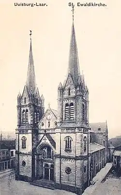 Mit dem Bau des Phoenix-Hüttenwerks in den 1850er Jahren begann in der einstigen Bauerschaft Laar ein rapides Bevölkerungswachstum. Eine erste katholische Kirche bestand seit 1874. 1892 wurde Laar zur selbständigen Pfarrei erhoben. 1898 bauten die Architekten Richard Odenthal und Carl Rüdell an der heutigen Friedrich-Ebert-Straße die neuromanische Kirche St. Ewaldi. Das Patrozinium der heiligen Brüder Ewaldi, Sachsenmissionare im 7. Jahrhundert, bezieht sich darauf, dass möglicherweise Laar und nicht Laer im Münsterland der Ort ihres Martyriums war.[1]