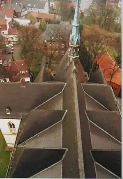 Auch die übrige Dachkonstruktion stammt aus dem 19. Jahrhundert. Sie ist viel niedriger als die alte und sehr kompliziert aufgebaut. Ein Langdach, das von einem spitzen Dachreiter getragen wird, liegt über dem Hauptschiff. Daran anschließend befinden sich Querdächer, die im rechten Winkel angeordnet sind. Über dem Chor verlaufen die Seitendächer wieder parallel zum langen Mitteldach. Das Dach über dem Kirchenraum ist – im Gegensatz zum kupferüberzogenen Turmdach – mit Schiefer bedeckt.