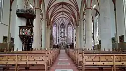 Sobald man in die spätgotische Hallenkirche geht, wird man von einer großen und lichten Halle erwartet. Die Größe entsteht dadurch, dass die beiden Seitenschiffe die gleiche Höhe haben wie das Mittelschiff und nur durch schlanke Rundpfeiler abgetrennt sind. Eine weitere Vergrößerung bewirkt der Turm, der in den Kirchenraum miteinbezogen ist. Er ist nach drei Seiten offen und steht auf zwei Dreiviertelpfeilern in der Westwand und auf zwei freistehenden massiven Rundpfeilern.