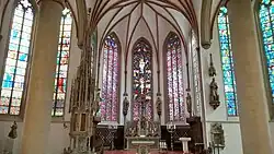 Der Altarraum, oder Chor, ist die Verlängerung des Mittelschiffes und hat einen 5/8-Schluss. Der Fußboden ist um drei Stufen erhöht, um den Altar als Mittelpunkt der Kirche hervorzuheben. Sieben der elf Fenster mussten nach dem Krieg erneuert werden. Besonders sind die drei mittleren Chorfenster, da sie sehr stark abgedunkelt sind und deshalb dem Besucher auffallen.