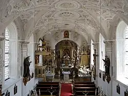 Der Innenraum des Chors im Erdgeschoss des Turms ist mit einem Kreuzgewölbe überspannt, der des Langhauses mit einem Stichkappengewölbe, das auf Pilastern an den Wänden aufsitzt. Der Stuck im Innenraum wird Mathias Schmuzer zugeschrieben.