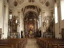 Die Decke im Chor ist ein Kreuzrippengewölbe, das bei der Umgestaltung in der Gotik in den romanischen Chor eingebaut wurde. Die Decke des Schiffes ist eine Spiegeldecke, die mit Fresken des Joseph Wannenmacher gestaltet ist. Im Schiff ist neben den Fresken Wannenmachers wenig Stuckzier zu finden, was auf die Prinzipien des Bettelordens zurückging. Dass der Chor in äußerst reichem Rokoko gestaltet ist, kann nur auf einer Ausnahme beruhen, die durch die besondere Verehrung der Gottesmutter begründet wird. Auch das Rippengewölbe im Chor ist in den Feldern mit Fresken ausgemalt. Der Hochaltar von Dominikus Zimmermann gilt als das bedeutendste Werk der Altarbaukunst des Rokokos und zeigt in seiner Mitte, über dem Tabernakel, erhöht auf einer Weltkugel stehend in einem weiteren Baldachin, die „Maria vom Siege“ in Lebensgröße. Es ist ein Baldachinaltar, der von sechs Säulen getragen wird, und dessen Kuppel bis an das Gewölbe reicht. Die Seitenaltäre sind einfache Altäre, die aber an den Stil des Hochaltars angepasst sind. Sie wurden vom Zimmermann-Schüler Anton Pfister aus Luzern geschaffen. Die Kanzel und das Chorgestühl, von dem nur noch die Rückwand erhalten ist, wurden vor den Altären geschaffen. Die Kanzel, die in Farbe und Struktur des Marmors anders als die Altäre ist, zeigt die Zeichen der vier Evangelisten. Der Schalldeckel wird von zwei Engeln getragen und vom Guten Hirten gekrönt.
