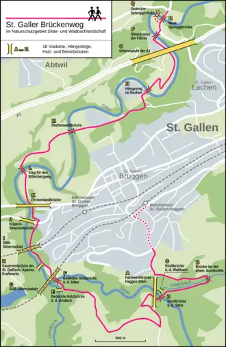 Der St. Galler Brückenweg ist ein 8,2 Kilometer langer Wanderweg, der am Bahnhof in St. Gallen-Haggen beginnt und bis nach Spisegg führt. Der als Nahtour 4 markierte Weg verläuft an 18 Viadukten, Holz-, Betonbrücken und Hängestegen vorbei durch die Flusslandschaft des Naturschutzgebietes Sitter- und Wattbachlandschaft. Bei jeder Brücke enthält eine Informationstafel Details über Bau, Baujahr und Konstruktion der Bauwerke.