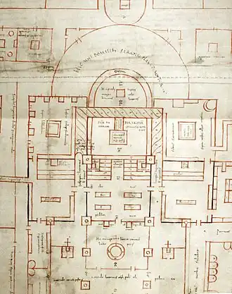 - ↑ Beat Brenk: Zum Problem der Vierflügelanlage (Claustrum) in frühchristlich-frühmittelalterlichen Klöstern. In: Peter Ochsenbein, Karl Schmuki (Hrsg.): Studien zum St. Galler Klosterplan II. 2002, S. 185–215; Barbara Schedl: Der Plan von St. Gallen. 2014, S. 95.