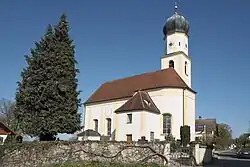 Die geostete barocke Saalkirche besitzt eine eingezogene Apsis. Im Süden ist die zweigeschossige Sakristei angefügt, der der Zwiebelturm gegenüber steht.[1]