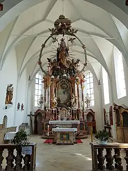 Der Hochaltar entstand trotz seiner Rokokoformen erst 1781. Das Altarblatt mit dem Motiv Maria vom guten Rat ist das Werk von Franz Anton Weiß (Rettenberg, bez. 1767) und zeigt die Übertragung des Gnadenbildes von Genazzano. Die Figuren seitlich des Altarbildes stellen St. Sebastian, St. Georg, St. Florian und St. Moritz dar und werden Maximilian Hitzelberger zugeschrieben. Die Figuren der hl. Dreifaltigkeit im Auszug schuf sein Sohn Johann Sigmund Hitzelberger.