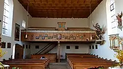 Die einfache Westempore ruht auf einer hölzernen Mittelsäule und ist mit einigen Votivbildern geschmückt.