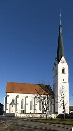 Die neugotische Saalkirche wurde 1866–68 nach einem Entwurf von Johann Marggraff errichtet. Sie besteht aus einem Langhaus, einem eingezogenen, dreiseitig geschlossenen Chor im Osten, die beide von Strebepfeilern gestützt werden, einer Sakristei an der Nordwand und einem Chorflankenturm an der Südwand des im Kern aus dem 15. Jahrhundert stammenden Chors. Der Turm wurde 1886 mit einem Glockengeschoss aufgestockt, in dessen Glockenstuhl vier Kirchenglocken hängen, und mit einem spitzen Helm bedeckt.