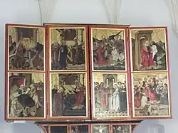 Bei geschlossenem innerem Flügelpaar sind acht Tafelbilder sichtbar: in der oberen Zeile Joachim im Tempel, die Zurückweisung seines Opfers, die Verkündigung an Joachim und die Begegnung unter der Goldenen Pforte, in der unteren Zeile Mariä Geburt, ihr Tempelgang, ihre Vermählung mit Josef, und die Heilige Sippe mit der Datierung.
