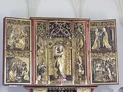 Das vollständig geschlossene Retabel zeigt die Tafelbilder der Mutter Gottes und der Heiligen Katharina, Dorothea und Martin auf der linken Seite sowie Barbara, Georg und Florian auf der rechten Seite.