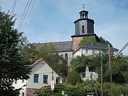 Diese Kirche steht westlich der Bundesstraße 88 am Fuß der Saalehänge beim Friedhof.