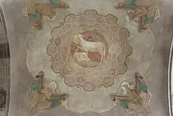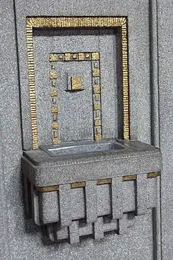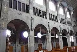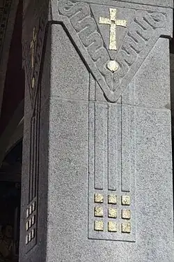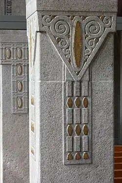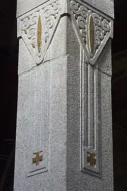 Eine besondere ästhetische Qualität besitzen die quadratischen Weihwasserbecken in Kunststein und mit goldenen Quadraten versehen. Hier und an den Wänden, Deckenpartien und Pfeilern wiederholt sich in vielen Varianten der ornamentale Schmuck, charakteristisch für die Zeit des Jugendstils.