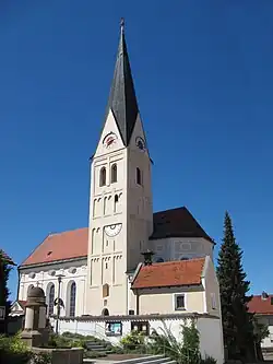 Das Gebäude ist ein Saalbau mit eingezogenem Chor und angefügter Sakristei. Der frühgotische Turm stammt vom Vorgängerbau aus der ersten Hälfte des 14. Jahrhunderts. Der Rest ist ein Neubau als Frühwerk von Anton Kogler (1701/03), erweitert 1861.