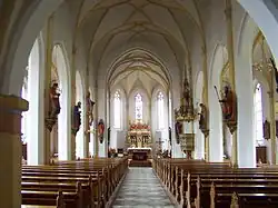 Der Innenraum wird von neugotischen Sterngewölben mit runden Schlusssteinen überspannt. Deren birnstabförmige Rippen entspringen aus halbrunden Wanddiensten mit profilierten Kapitellen. Ansonsten sind die Wände ohne Gliederung. Der Chorbogen, die Schildbögen und die Übergänge zwischen den Schiffen sind spitzbogig ausgeführt. Die mächtigen Pfeiler, die die drei Schiffe trennen, sind an den Kanten gefast. Da es sich um eine Pseudobasilika handelt, ist kein Obergaden vorzufinden. Der Altarraum ist gegenüber dem Langhaus um drei Stufen erhöht. Das westliche Langhausjoch wird in der ganzen Breite von einer Doppelempore überspannt, deren Brüstungen mit neugotischem Blendmaßwerk verziert sind. Auf dem oberen Emporengeschoss ist die Orgel untergebracht. Der Zugang zu den Emporen erfolgt über zwei Wendeltreppen, die zu beiden Seiten des Hauptportals angeordnet sind.[1][5]