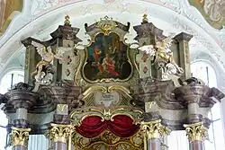 - Die Kanzel wurde von Johann Michael Bertele geschaffen und 1740/41 eingebaut. Der Kanzelkorpus ist mit den vergoldeten Evangelistensymbolen verziert. Der Schalldeckel wird von der Skulptur des Erzengels Michael bekrönt, der Rand ist mit Puttenköpfen besetzt. Die Schnitzfiguren werden Johann Michael Fischer zugeschrieben.