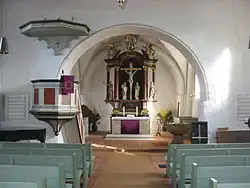 Das Chorgestühl stammt aus der Zeit um 1600, ebenso die kleine Schranktür neben dem Altar mit dem Relief der Mariä-Verkündigung; sie war ursprünglich Teil einer alten Kanzel.
