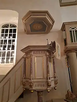 Das Innere wird von einer hölzernen Felderdecke geschlossen. Die vermutlich aus der Zeit um 1747 entstandene ornamentale Deckenbemalung wurde im Jahr 1965 wiederhergestellt. An den Seiten sind eingeschossige Emporen eingebaut, die 1839 von neuem erbaut wurden.