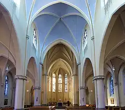 Es handelt sich um eine dreischiffige kreuzrippengewölbte Basilika mit neogotischen Formen mit vorgesetztem Turm, vorspringendem Querhaus und polygonalem, durch ein schmales Zwischenjoch verlängertem Chor mit 7/12 Schluss.