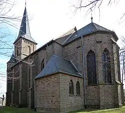 Über die Baugeschichte ist nicht viel bekannt. Um das 14. Jahrhundert wurde eine Kapelle im Stil der Gotik erbaut. Ob es einen Vorgängerbau gegeben hat, ist unbekannt. Im 18. Jahrhundert wurde die Kapelle bis auf den Turm abgerissen und neu erbaut, im 19. Jahrhundert wurde eine Sakristei angebaut. Ende des 19. Jahrhunderts genügte das Gotteshaus, welches seit 1857 Pfarrkirche war, nicht mehr den Ansprüchen der Gläubigen, weshalb ein Neubau beschlossen wurde. Zwischen 1897 und 1898 wurde an anderer Stelle die heutige Pfarrkirche nach Plänen des Kölner Architekten Theodor Kremer erbaut. Die alte Kirche wurde daraufhin abgerissen, nur die Sakristei blieb bestehen und dient heute als Friedhofskapelle. Die feierliche Kirchweihe der neuen Pfarrkirche fand am 1. August 1906 statt.[2]