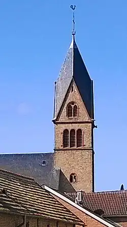Man errichtete eine neuromanische Pseudobasilika nach den Plänen des Mainzer Kirchenbaumeisters Ludwig Becker. Die Außenwände bestehen aus hellbraunen Bruchsteinen mit Gliederungen aus rotem Sandstein. Die Dächer sind mit Schieferplatten gedeckt. Im Innern sind die Wände verputzt und weiß gestrichen, die Rundbögen und Säulen sind farblich akzentuiert. Das nach Südosten ausgerichtete Kirchenschiff ist von einem Querschiff durchschnitten und hat ein Kreuzgratgewölbe. Das Hauptschiff endet mit dem Chorraum in einer breiten Apsis. Sie ist mit sieben Fenstern und darunter mit einem Rundbogenfries gestaltet. Am anderen Ende des Hauptschiffs befindet sich eine Empore mit der Orgel. Das Querschiff geht in zwei Seitenschiffe über. Diese sind durch Pfeilerarkaden vom Hauptschiff getrennt und besitzen ebenso Apsiden. Der 36 Meter hohe Kirchturm steht vor dem Hauptschiff und hat ein spitz zulaufendes rautenförmiges Dach.