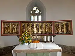 Wertvollster Einrichtungsgegenstand ist der gotische Flügelaltar aus den 1510er Jahren in der rekonstruierten Form von 1989/90. Nicht erhalten sind die Schleierbretter und die Profilleisten. Die originale Predella wurde im 17. Jahrhundert neu gefasst und zeigt die Abendmahlsszene. Die Rückseite des Mittelschreins und die Außenseiten der Flügeltüren weisen beschädigte Tafelmalereien aus spätgotischer Zeit mit weiblichen Heiligen als Halbfiguren auf, darunter die heilige Ottilie.[7] Die Innenseiten beherbergen 14 Schnitzfiguren, von denen aufgrund der entfernten Attribute nur einige sicher zu deuten sind. Sieben Figuren stehen im 1,60 Meter × 0,70 Meter großen Mittelfeld, von links nach rechts: Simon Zelotes, Jakobus der Ältere mit Hut, ein Heiliger mit Buch, Simon Petrus (?), ein Heiliger mit später ergänztem Buch und Palmwedel, ein Heiliger mit einem Beutelbuch und ein Heiliger mit Buch (Johannes?). Der linke Flügel zeigt vier Figuren: Elisabeth (Tuch mit Krone, Krug und Bettler), Nikolaus mit dem Bischofsstab und drei Klumpen auf dem Buch, einen Bischof mit Palmwedel und Amalberga. Auf dem rechten Flügel sind drei Figuren zu sehen, eine bekrönte Heilige ohne Attribut, ein Heiliger mit einem Beutel (Matthäus?) und rechts Georg mit dem Drachen.[8]