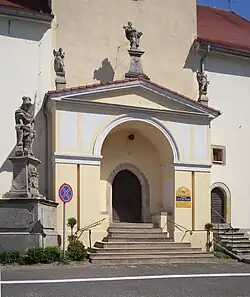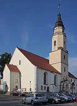 Im südlichen Seitenschiff ist ein Glockenturm eingebaut. Der Chor an der Ostseite ist rechteckig mit schräg beschnittenen Ecken und abgestuften Strebepfeilern. Das Mittelschiff trägt ein Tonnengewölbe, die Seitenschiffe Netzgewölbe, der Chor ein Kreuzrippengewölbe. Das Gewölbe des Mittelschiffes ist mit Sgraffitoputz geschmückt.