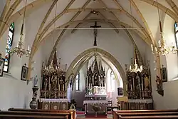 Über dem dreijochigen Langhaus spannt sich ein um 1500 entstandenes Netzrippengewölbe auf kurzen Absenkern mit vier quadratischen, einem runden und zwei Wappenschlusssteinen, über dem späteren, westlichen Emporenjoch ein Tonnengewölbe, das durch einen Gurtbogen auf starken Wandpfeilern vom Schiff getrennt wird. Die hölzerne Orgelempore steht auf achteckigen Holzstützen. In der Nordwand des östlichen Jochs ist eine Spitzbogennische eingelassen. Der tief herabgezogene Triumphbogen mit Spitzbogenöffnung verbindet das Langhaus mit dem eingezogenen, zweijochigen Chor mit Netzrippengewölbe auf kleinen Konsolen und 3/8-Schluss. Ein Spitzbogenportal an der Chornordwand führt in die Sakristei.