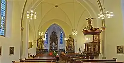 - Die prachtvolle Kanzel ist nach einer Bezeichnung im Wappen an der Rückseite eine Arbeit von 1668, sie ist mit einer Figur, die den Drachentöter Michael im Gewand eines Zenturio darstellt, bekrönt. Die Grundfarben von Korb und Schalldeckel sind Fürstenbergrot und Gold. Die Nischen des Korbes sind mit Figuren des Christus, des Petrus und des Paulus gefüllt.[8]
