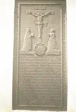 An der Ostwand der Sakristei war bis etwa 1960 eine Sandsteintafel für den 1692 verstorbenen Bürgermeister Anton Schnorbusch und für dessen 1665 verstorbenen gleichnamigen Vater angebracht. Sie hatte eine Höhe von 2,12 Meter und eine Breite von 95 Zentimetern. Sie wurde von dort entfernt und liegt mittlerweile zerbrochen bei der Merklinghäuser Kapelle.[15] Eine zweite gusseiserne Grabplatte für den 1686 verstorbenen Hallenberger Richter Johannes Synesius und dessen Ehefrau Anna Maria Bange steht aufrecht am östlichen Ende der Pfarrkirche. Sie hat eine Höhe von zwei Metern und eine Breite von einem Meter.[16]
