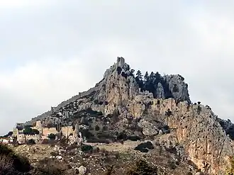 Ein im 9./10. Jahrhundert auf dem Berg errichtetes Kloster war nach dem Eremiten St. Hilarion, einem Einsiedler aus dem 4. Jahrhundert, der seine letzten Lebensjahre im Pentadaktylos verbrachte, benannt. Um 1100 wurde es wahrscheinlich in die Festung integriert. Die heute als Ruine vorhandene Kirche ist dem byzantinischen Kloster zuzurechnen und stammt etwa aus dem 10./11. Jahrhundert. Im Auftrag von Richard Löwenherz belagerte Guido von Lusignan 1191 die als uneinnehmbar angesehene Burg, um sie danach auf Anweisung des Statthalters Isaak Komemnos an die Franken zu übergeben. Die Tochter Isaaks wurde daraufhin von Guido von Lusignan auf der Burg gefangengehalten.