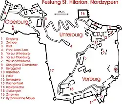 Die Burganlage gliedert sich in Ober-, Unter- und Vorburg. St. Hilarion verfügte über insgesamt drei Verteidigungslinien an der Ostseite. Die anderen Seiten der Burg waren durch Steilabfall genug gesichert und mussten nicht extra befestigt werden. Durch den Zwinger betritt man die Vorburg, in der neben Stallungen und einer Kaserne für die Soldaten auch eine große Zisterne war. Durch ein mit einer Zugbrücke gesichertes Tor gelangte man in die Unterburg mit der Klosterkirche. Diese war mit einer großen Kuppel ausgestattet und gehört dem Typus einer so genannten Acht-Stützen-Kirche an. Daneben befand sich eine große Halle, das einstige Refektorium. Östlich liegt das Belvedere, eine Plattform mit einer guten Aussicht auf das Pentadaktylos und die Küstenregion, und die einstigen königlichen Gemächer.